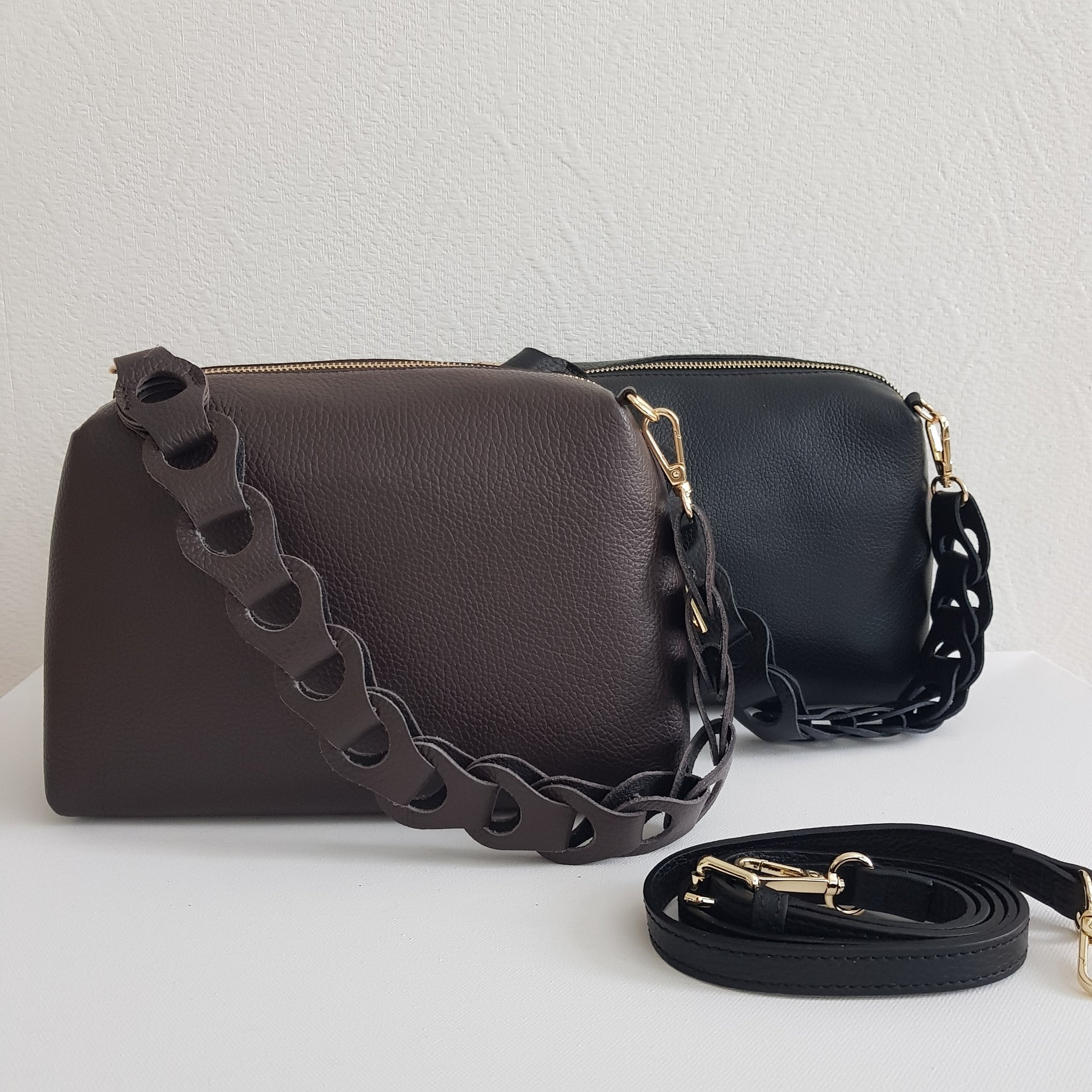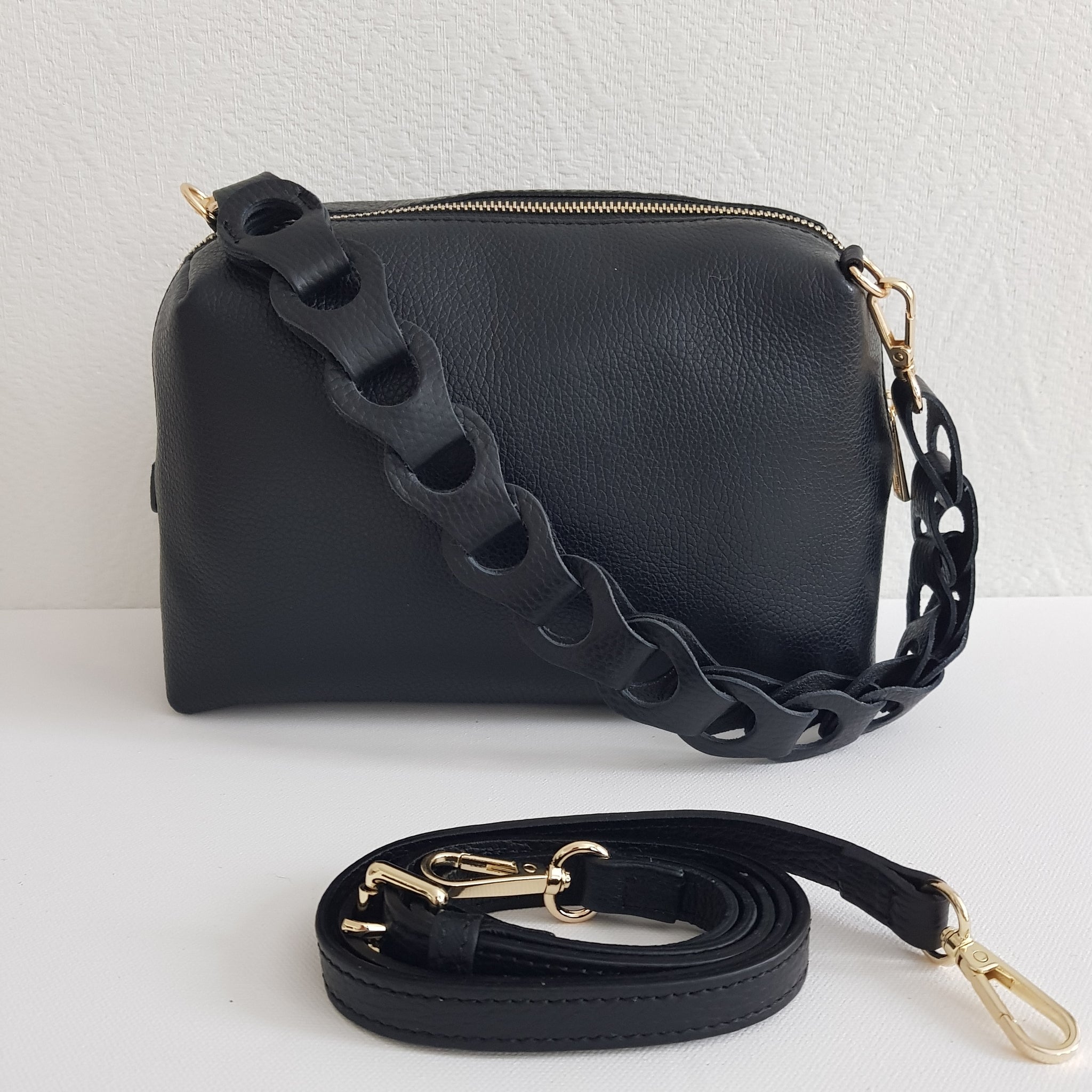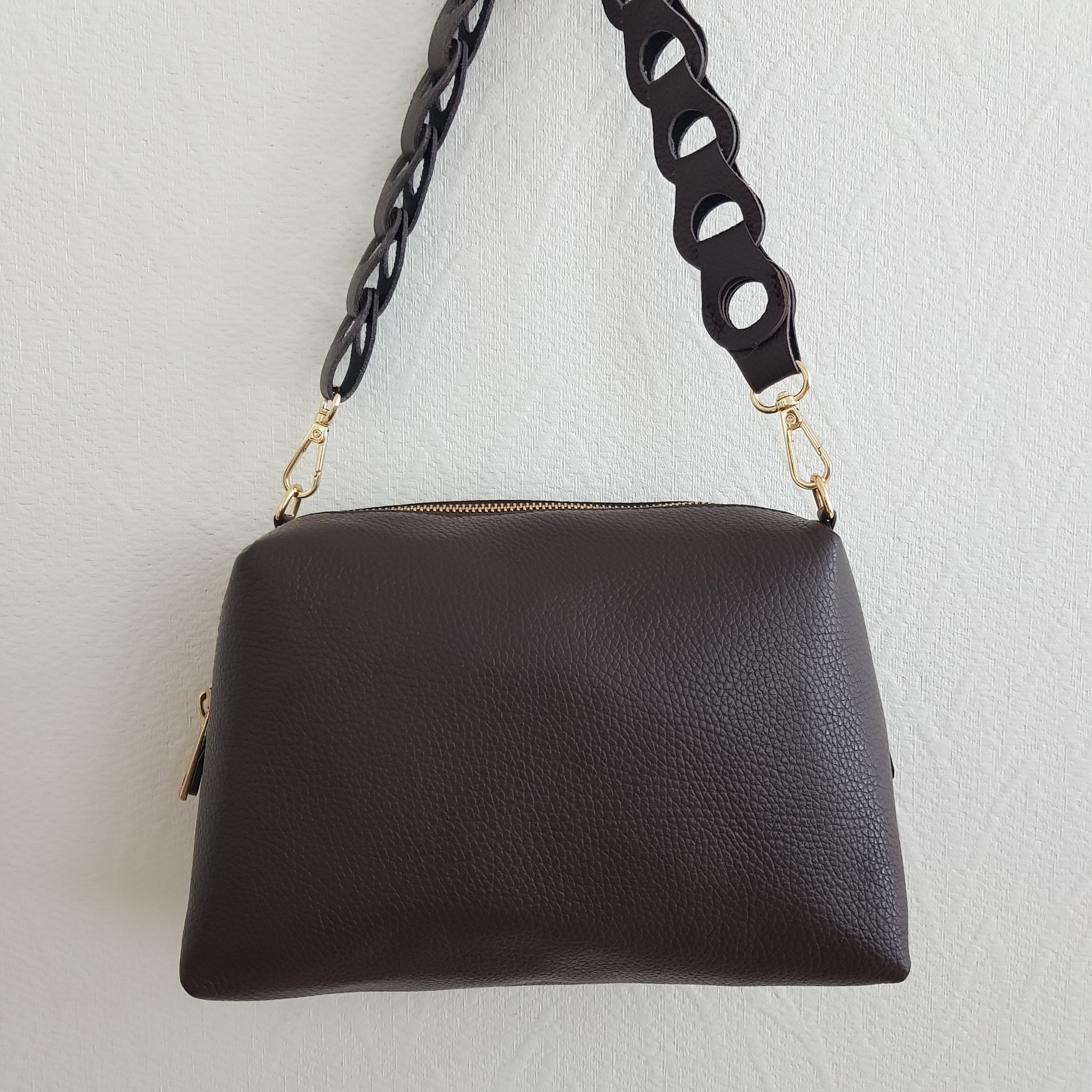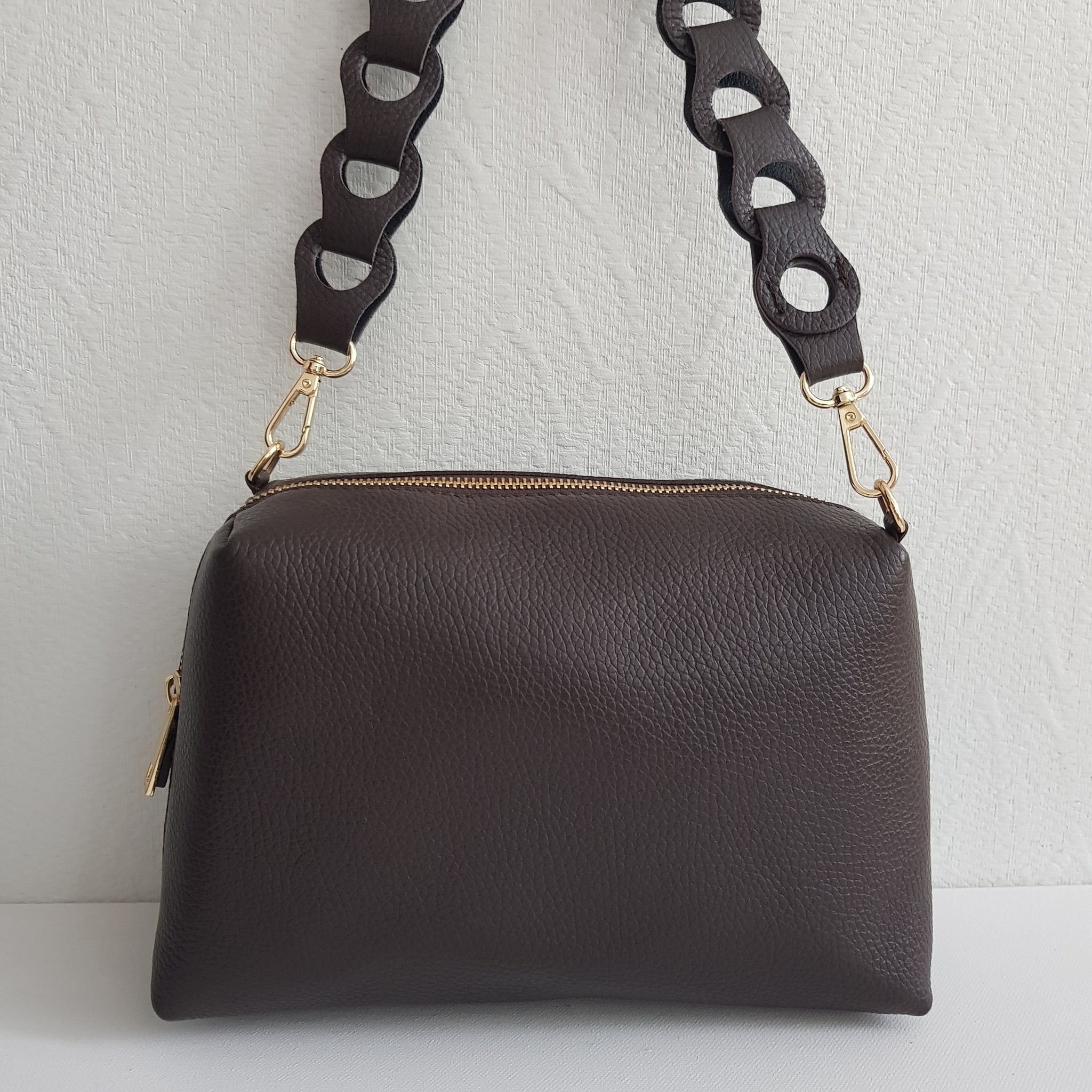 Kompakti ja tyylikäs crossbody-laukku, jossa näyttävä punottu kantohihna ja kapea, säädettävä olkahihna. Valmistettu Italiassa aidosta nahasta, kullanvärisillä metalliosilla viimeisteltynä. Sisällä yksi tilava lokero ja vetoketjullinen piilotasku.