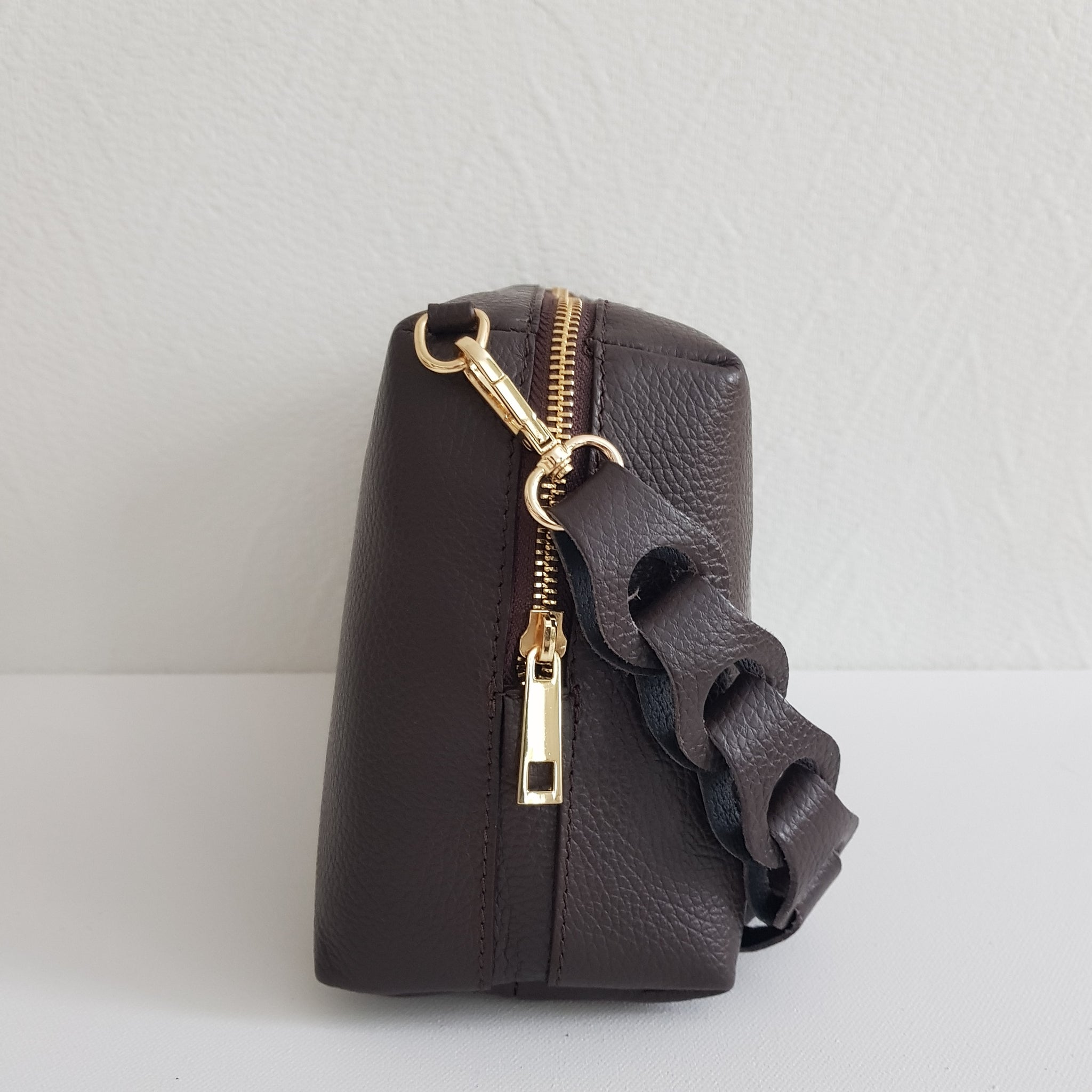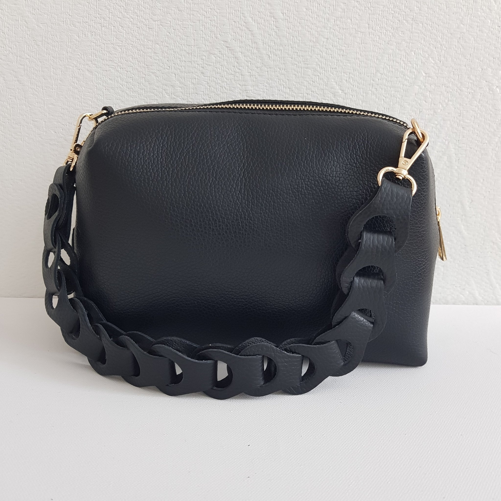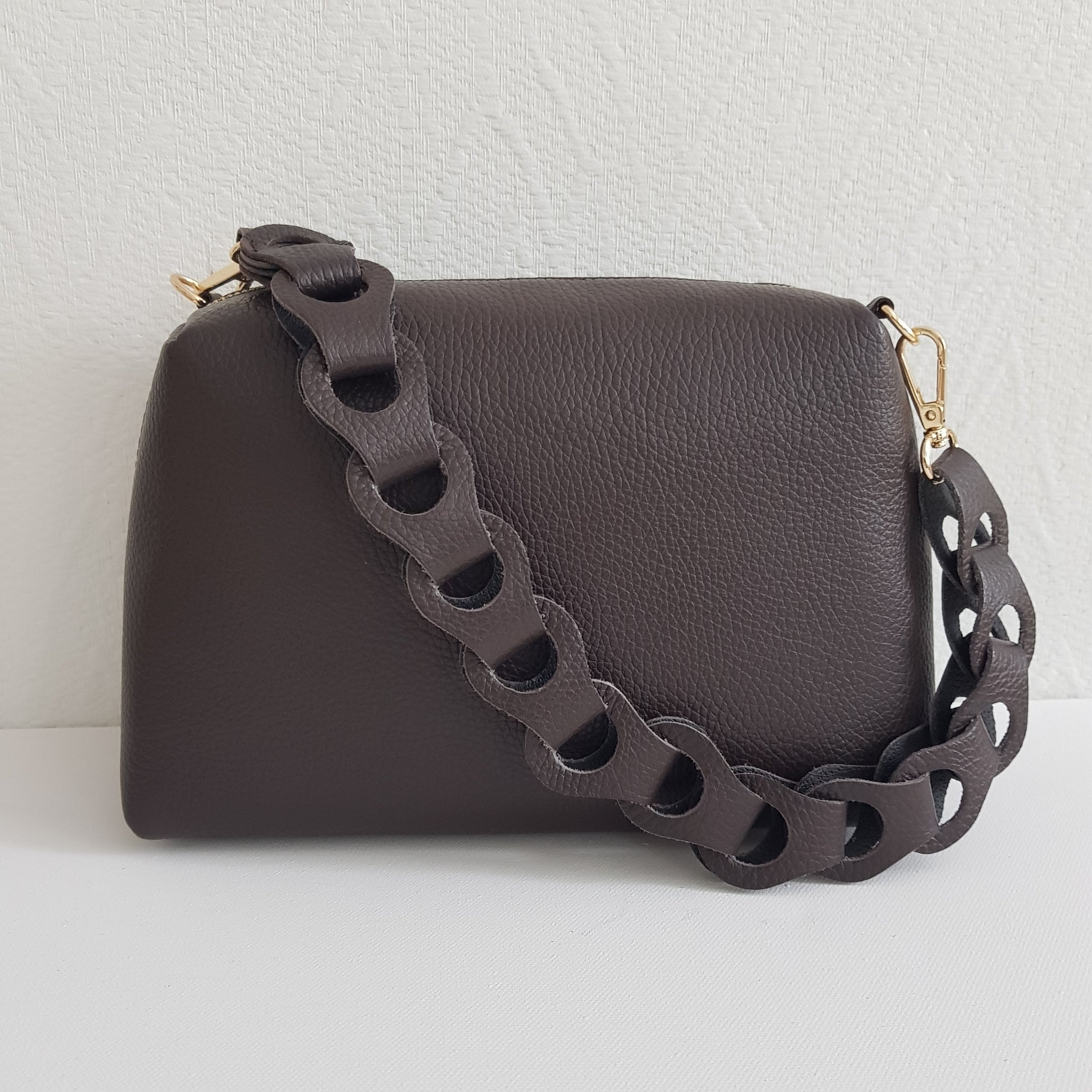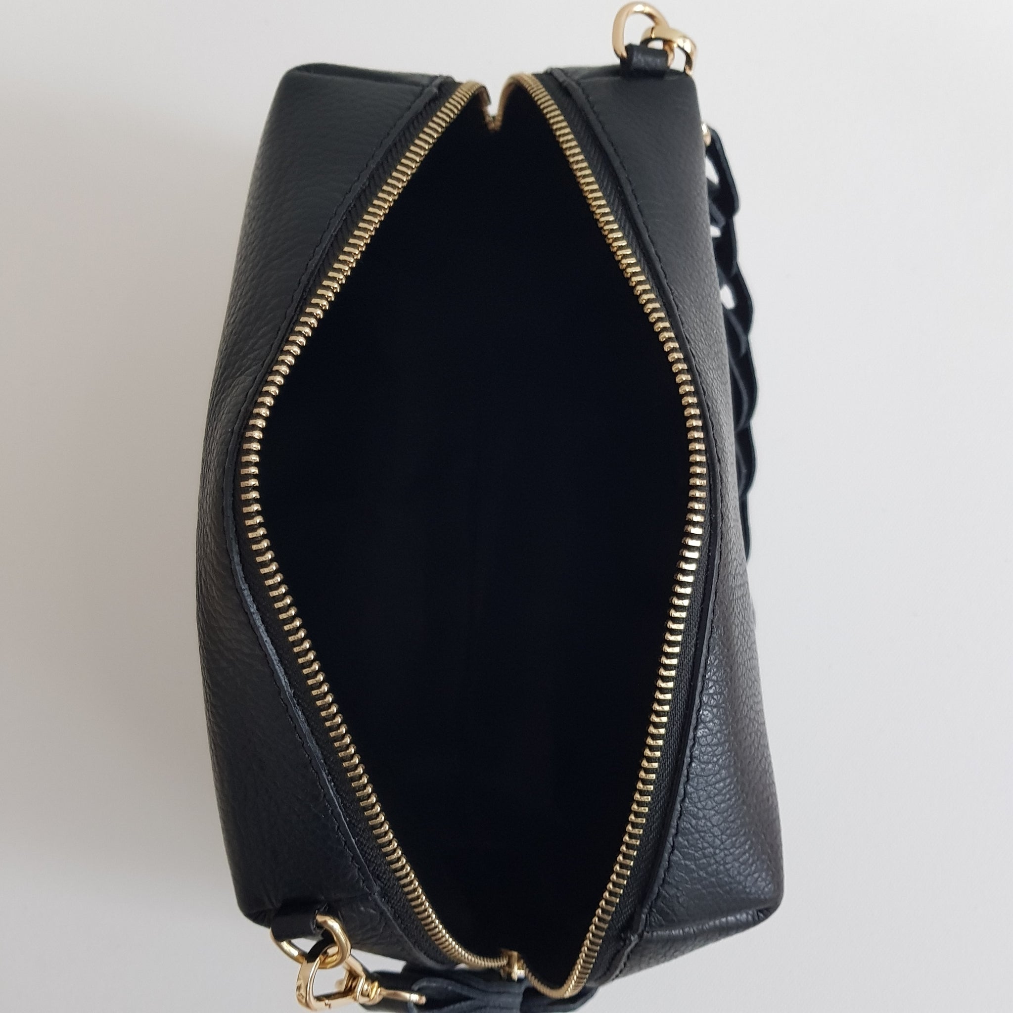 Kompakti ja tyylikäs crossbody-laukku, jossa näyttävä punottu kantohihna ja kapea, säädettävä olkahihna. Valmistettu Italiassa aidosta nahasta, kullanvärisillä metalliosilla viimeisteltynä. Sisällä yksi tilava lokero ja vetoketjullinen piilotasku.