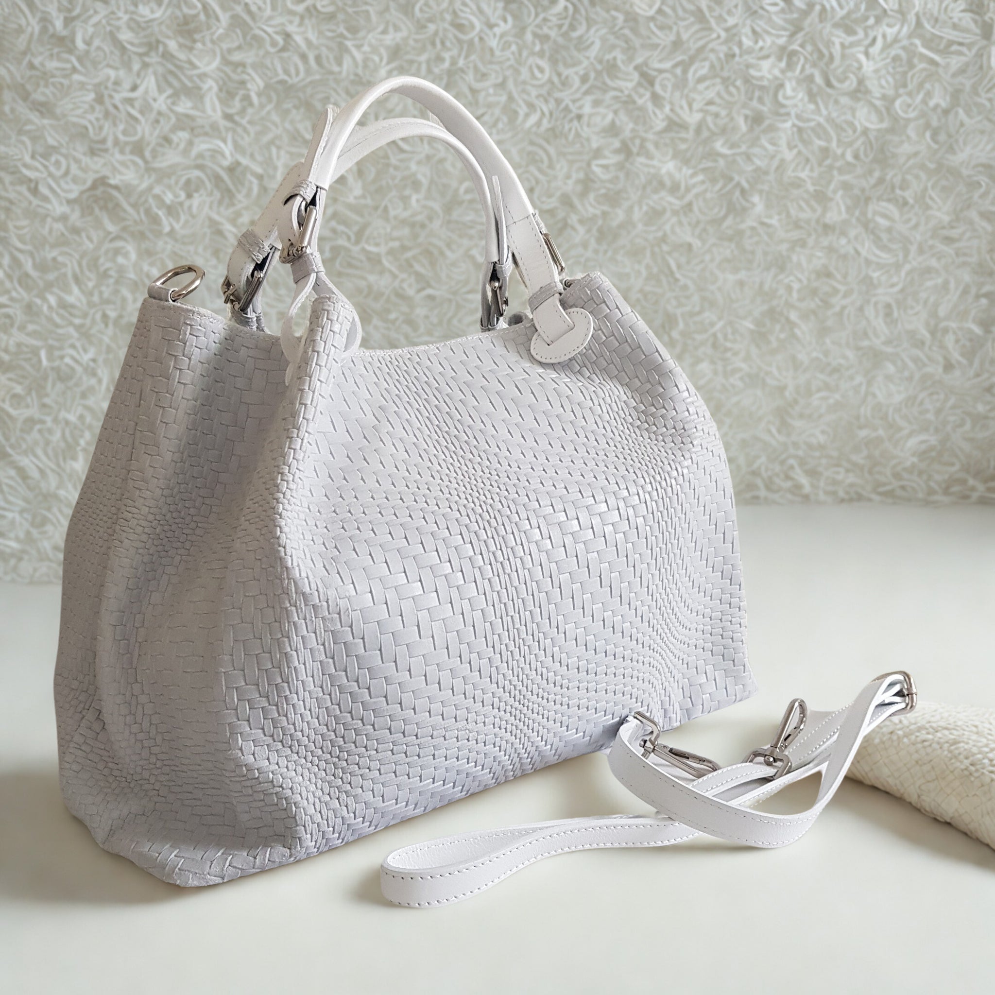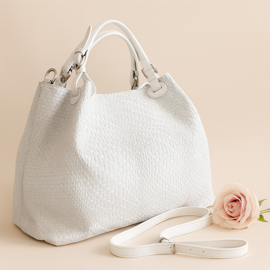Upea CHIARA laukku on tunnetun Bottega Veneta brändin inspiroima malli. Tyylikäs ja tilava laukku on valmistettu aidosta intrecciato punotusta nahasta. Sisällä on vetoketjullinen tilanjakaja sekä vetoketjullinen sivutasku sekä avotasku.  Väri: valkoinen  Kantokahvat ja olkahihna on säädettävät.  Koko: korkeus 32 cm, leveys 50 cm, syvyys  19  cm  Olkahihnan koko: leveys  2 cm, max pituus 125   cm  Valmistettu Italiassa.