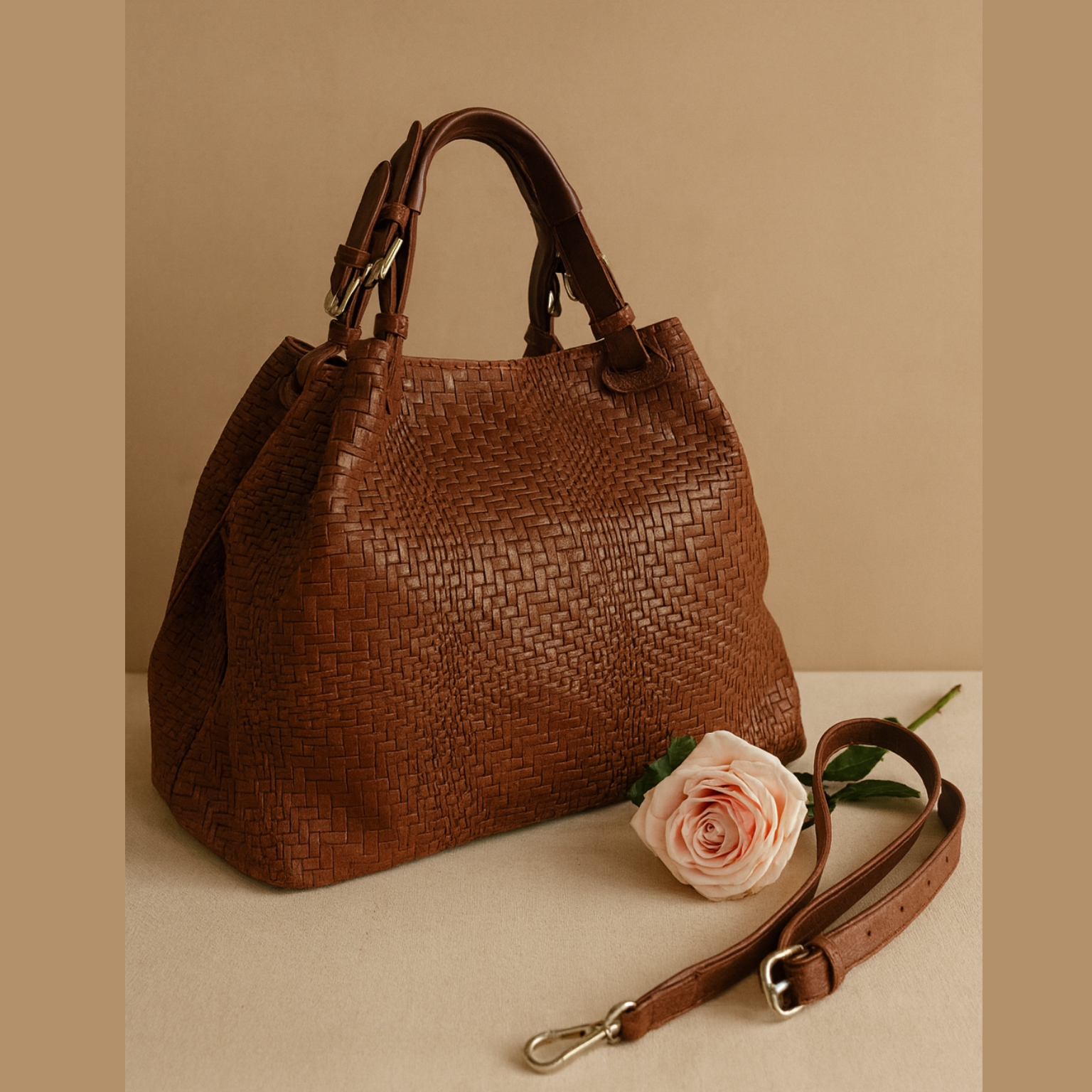 Upea CHIARA laukku on tunnetun Bottega Veneta brändin inspiroima malli. Tyylikäs ja tilava laukku on valmistettu aidosta intrecciato punotusta nahasta. Sisällä on vetoketjullinen tilanjakaja sekä vetoketjullinen sivutasku sekä avotasku   Väri: ruskea  Kantokahvat ja olkahihna on säädettävät.  Koko: korkeus 32 cm, leveys 50 cm, syvyys  19  cm  Olkahihnan koko: leveys  2 cm, max pituus 125   cm  Valmistettu Italiassa.