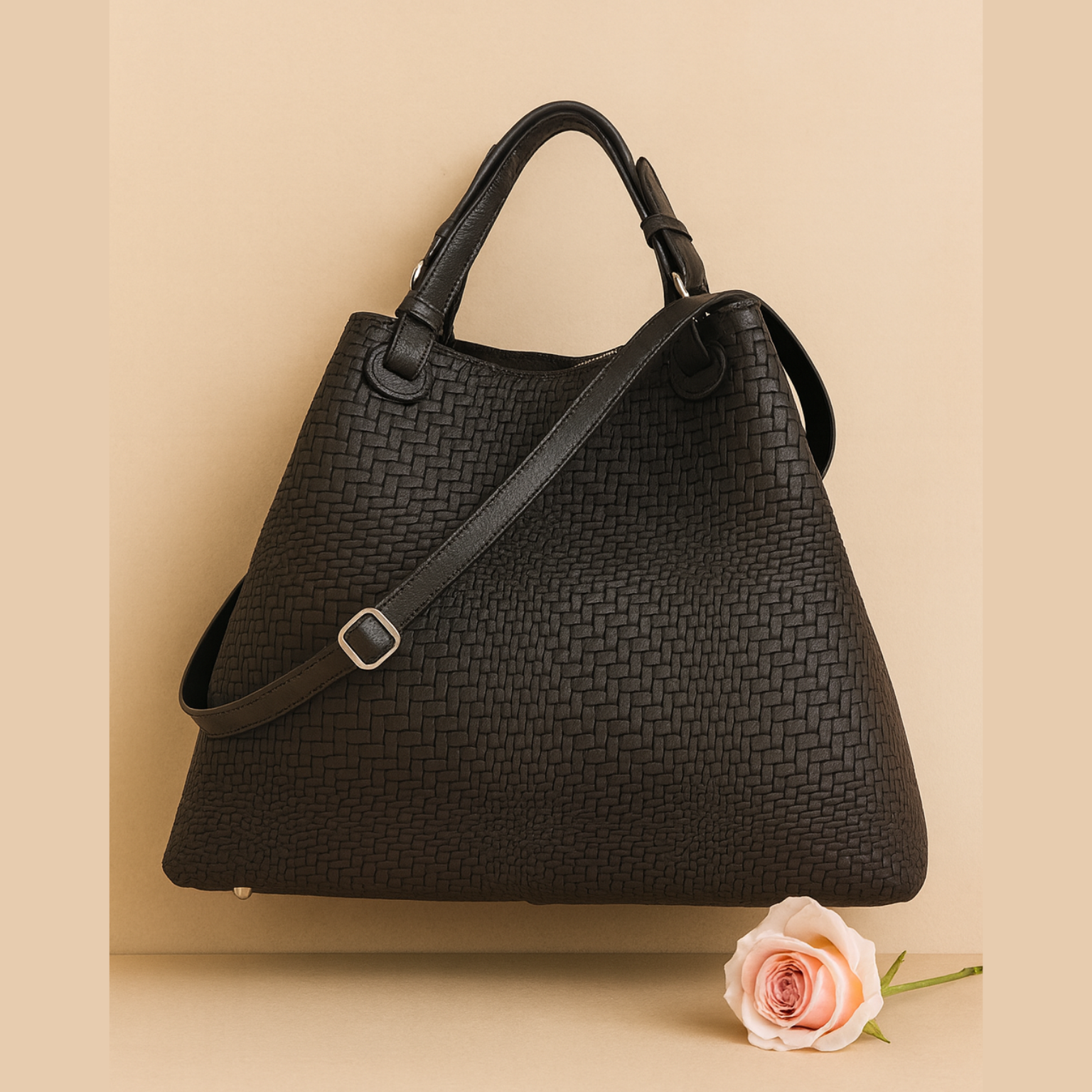 Upea CHIARA laukku on tunnetun Bottega Veneta brändin inspiroima malli. Tyylikäs ja tilava laukku on valmistettu aidosta intrecciato punotusta nahasta. Sisällä on vetoketjullinen tilanjakaja sekä vetoketjullinen sivutasku ja avotasku.  Väri: ruskea  Kantokahvat ja olkahihna voi säätää.  Koko: pituus  44cm, korkeus 33 cm, syvyys 20 cm  Olkahihnan koko: leveys 2 cm, max pituus 125 cm  Valmistettu Italiassa.