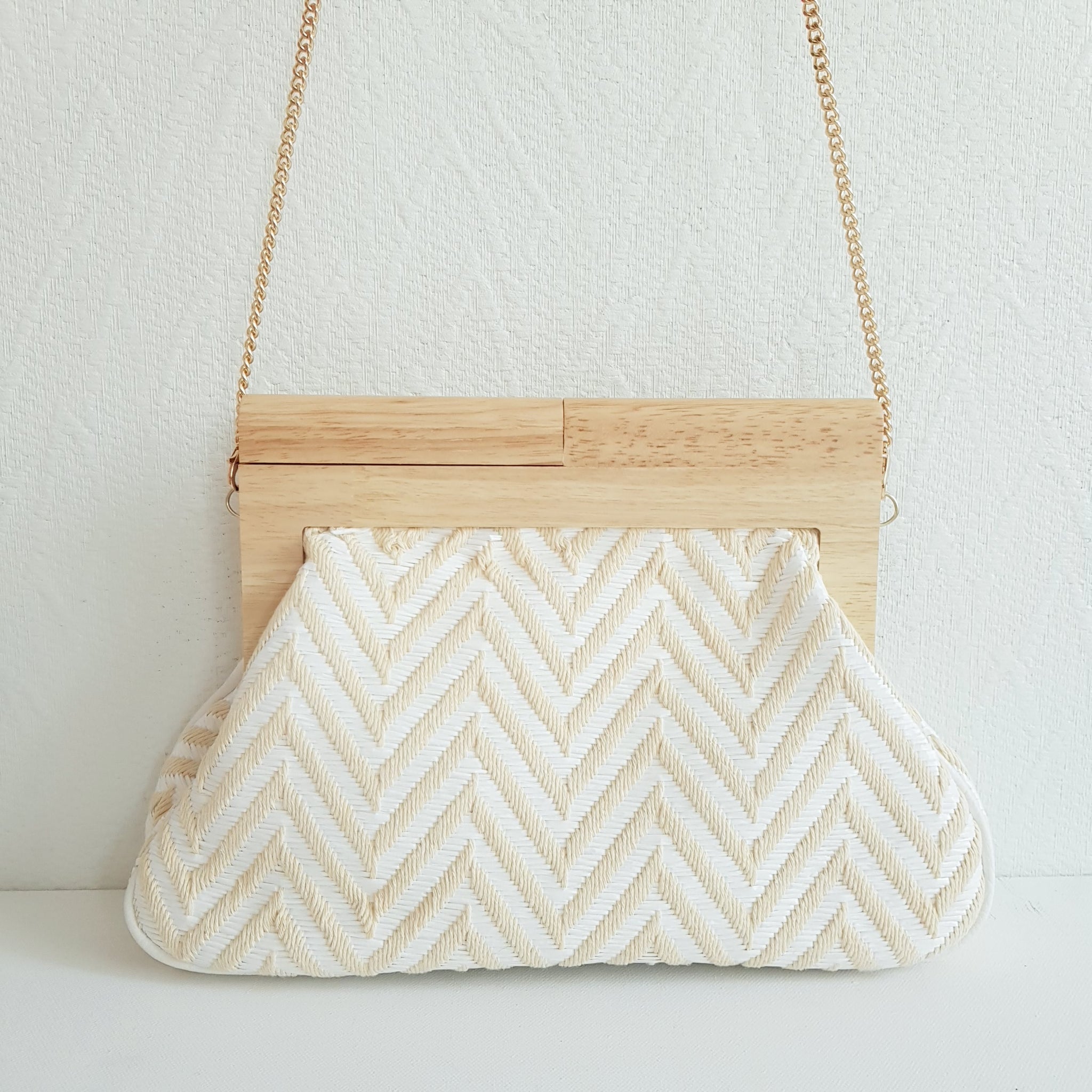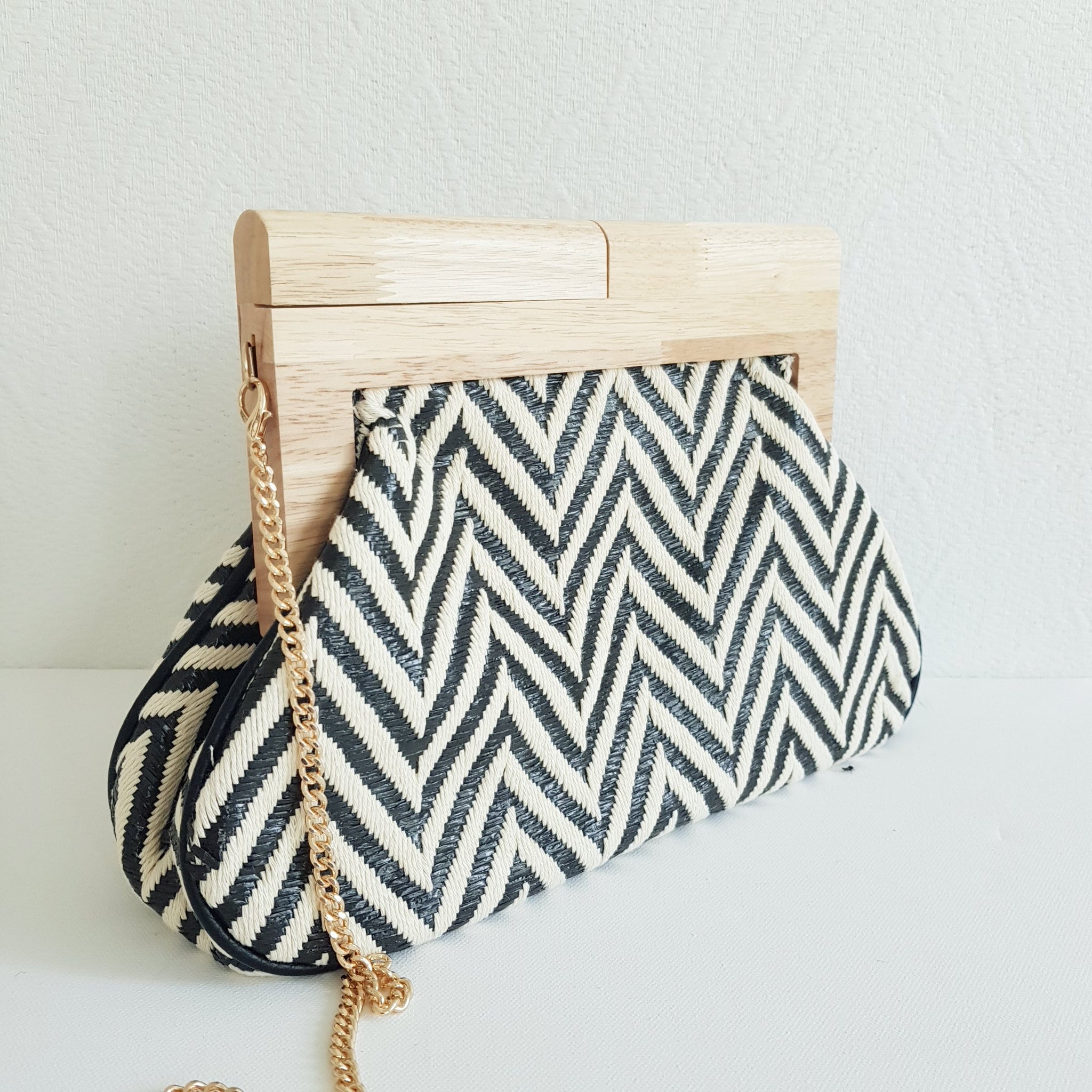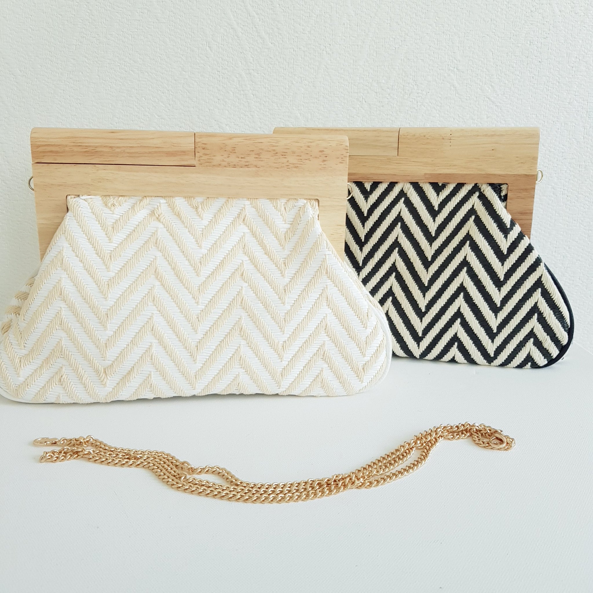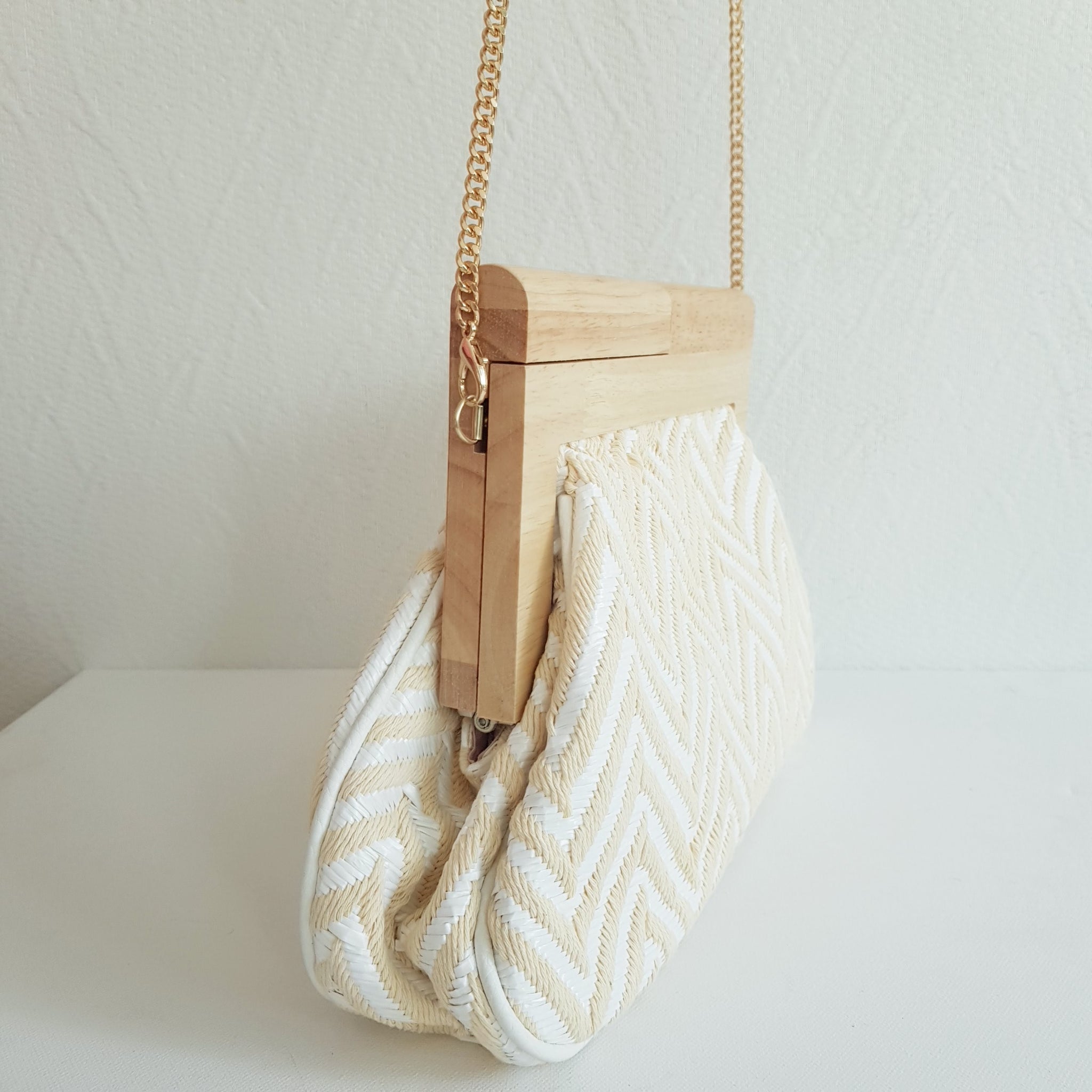 Kaunis kesälaukku, joka on saatavilla kahdessa värissä: beige/kulta ja musta/valkoinen. Laukussa on puinen käsiosa, metallinen olkahihna, magneettilukitus.