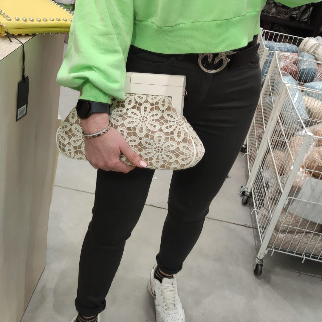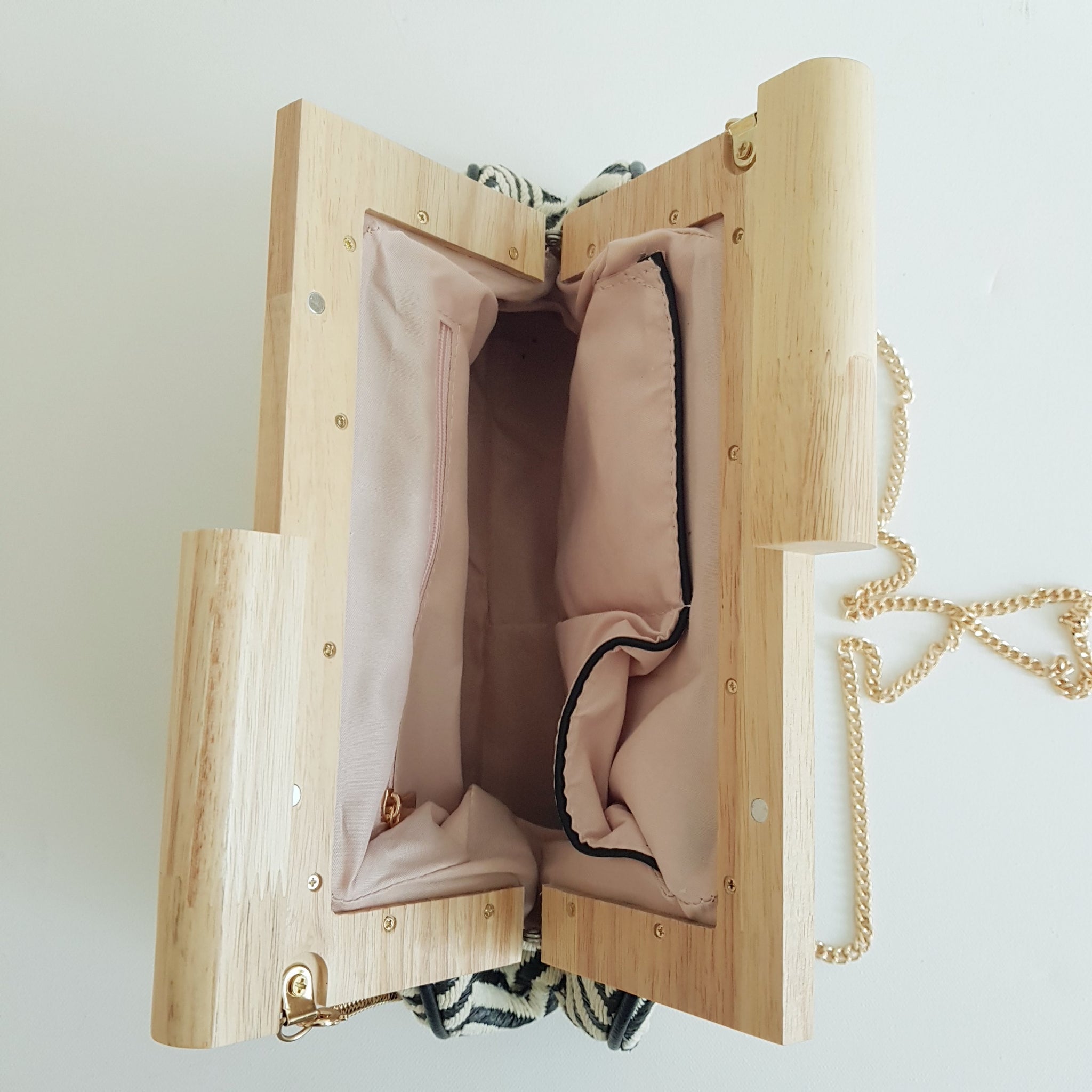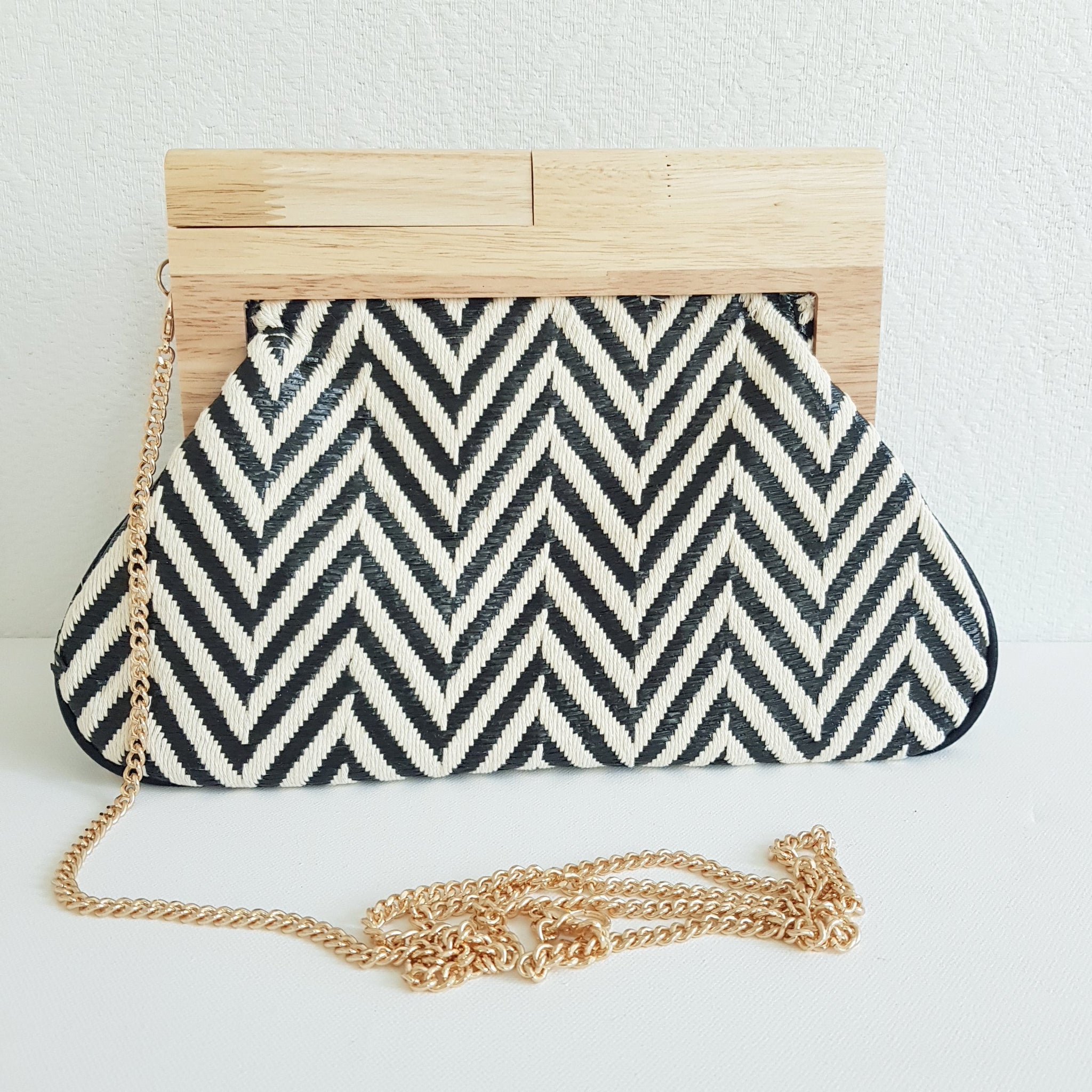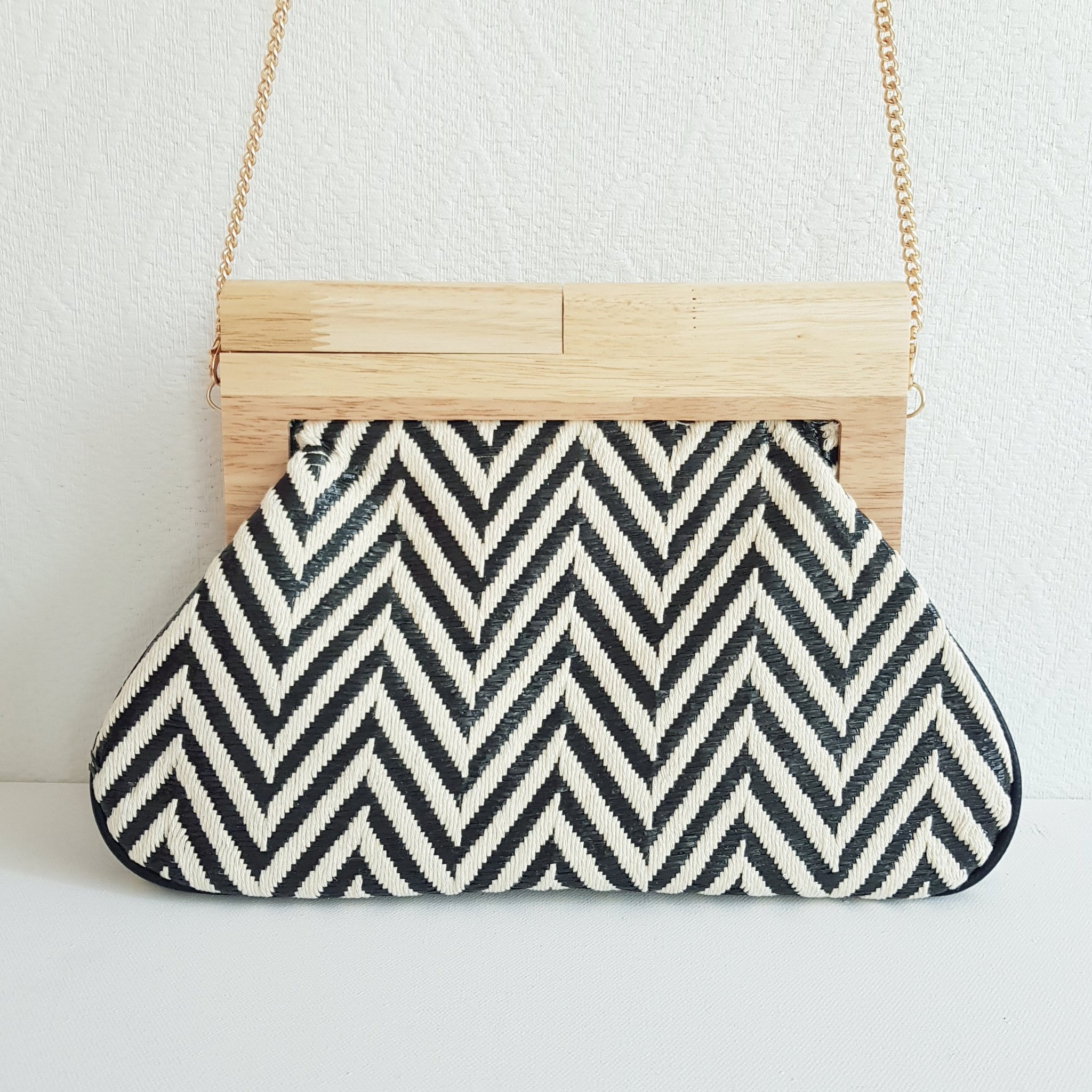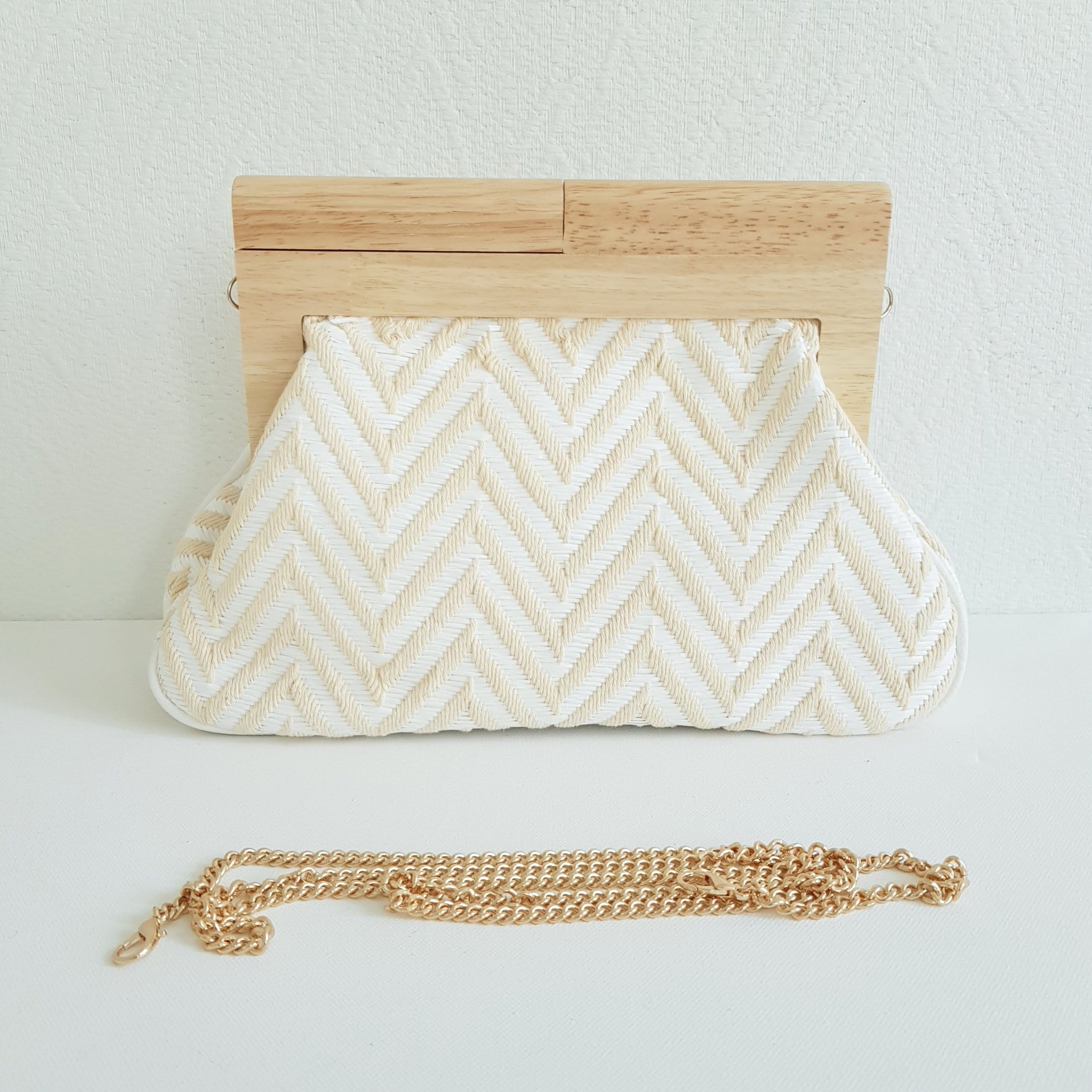 Kaunis kesälaukku, joka on saatavilla kahdessa värissä: beige/kulta ja musta/valkoinen. Laukussa on puinen käsiosa, metallinen olkahihna, magneettilukitus.