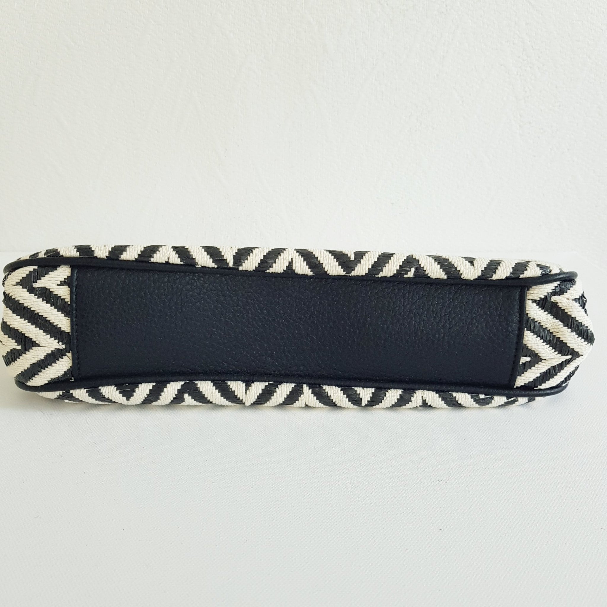 Laukun kuviossa on siksak-kuosi, joka tuo siihen elävyyttä. Vaaleampi versio on beigen ja kullan sävyinen, kun taas tummempi on mustavalkoinen. Laukku näyttää tyylikkäältä ja sopii hyvin kesäkäyttöön.