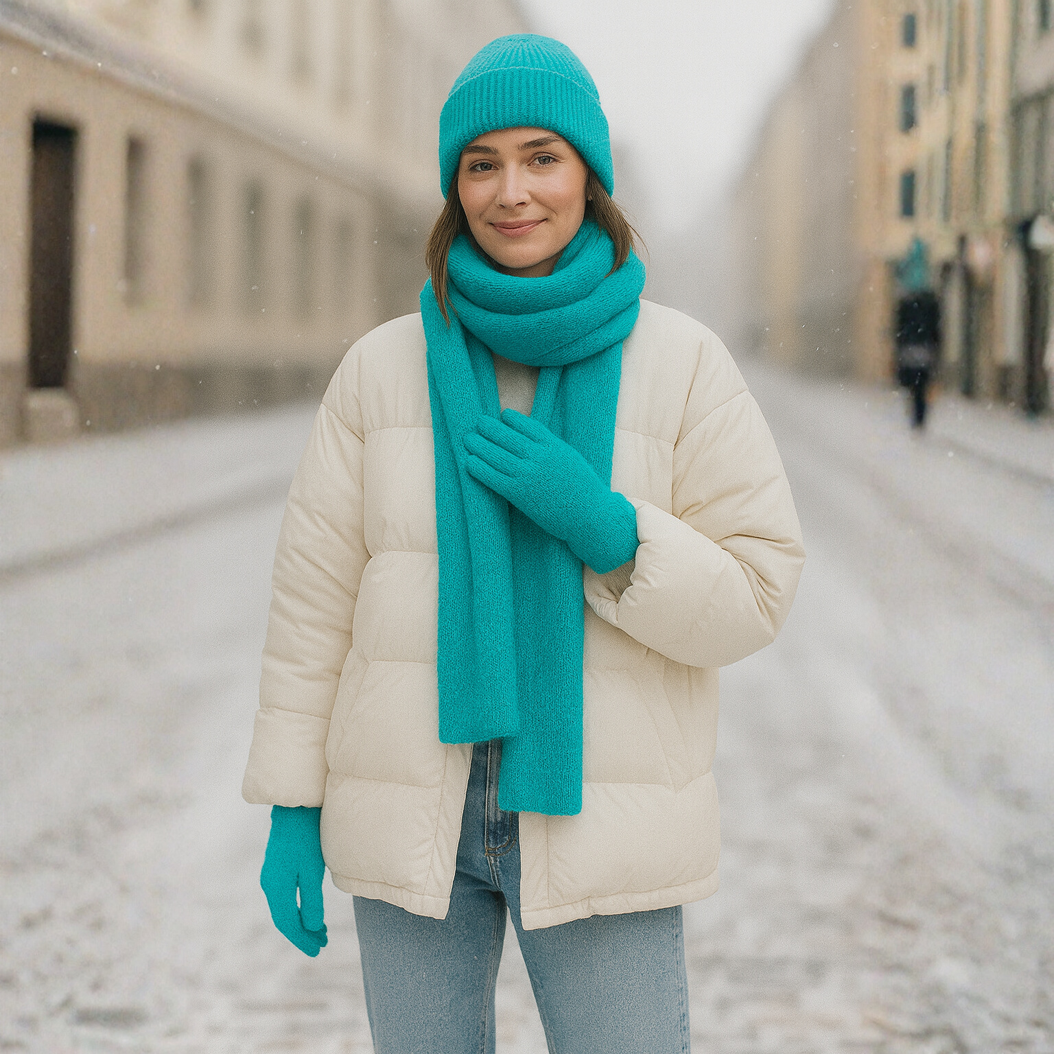 Huivin rento pituus, täydellisesti istuva pipo ja mukavat käsineet tekevät tästä setistä luottokumppanin kylmään kauteen.