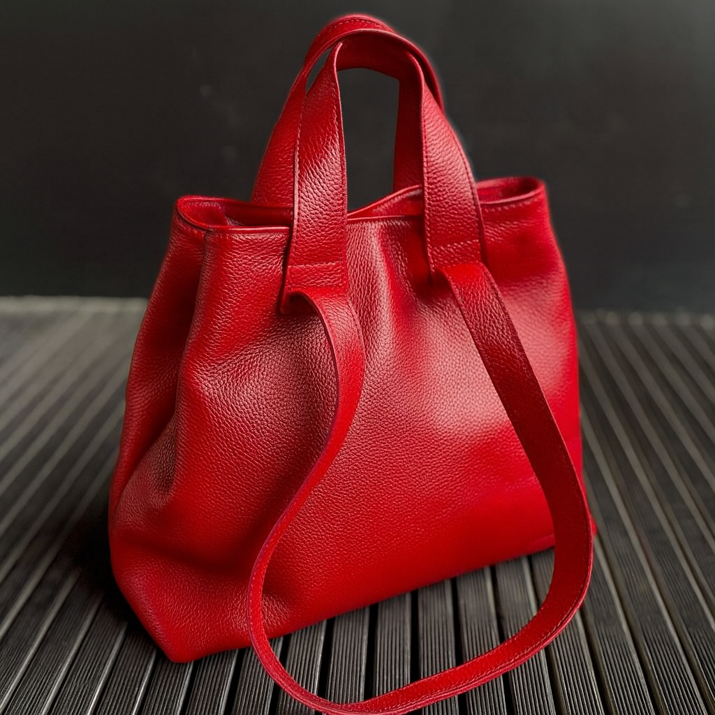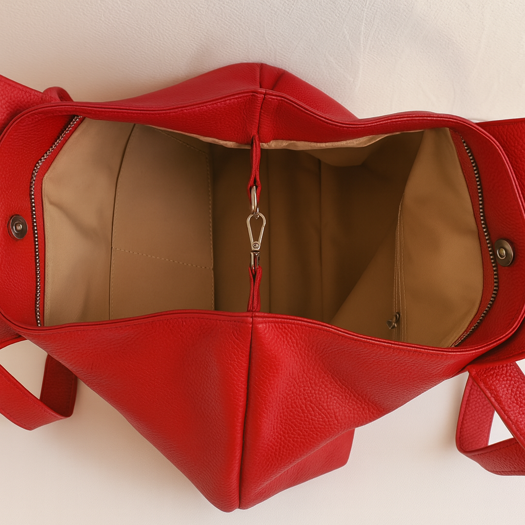 Laukussa on kaksi paria kantokahvoja: lyhyet kahvat kädessä kantamiseen ja pidemmät olkahihnat (70 cm), jotka istuvat mukavasti olalle. Pohjassa olevat metallinupit viimeistelevät designin ja suojaavat nahkaa arjen käytössä.
